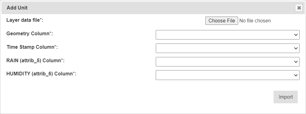 Each layer attribute (RAIN and HUMIDITY in the above example) will appear as a field and users will need to specify each column in the CSV for each layer attribute. Users may not skip any of the layer attributes. |